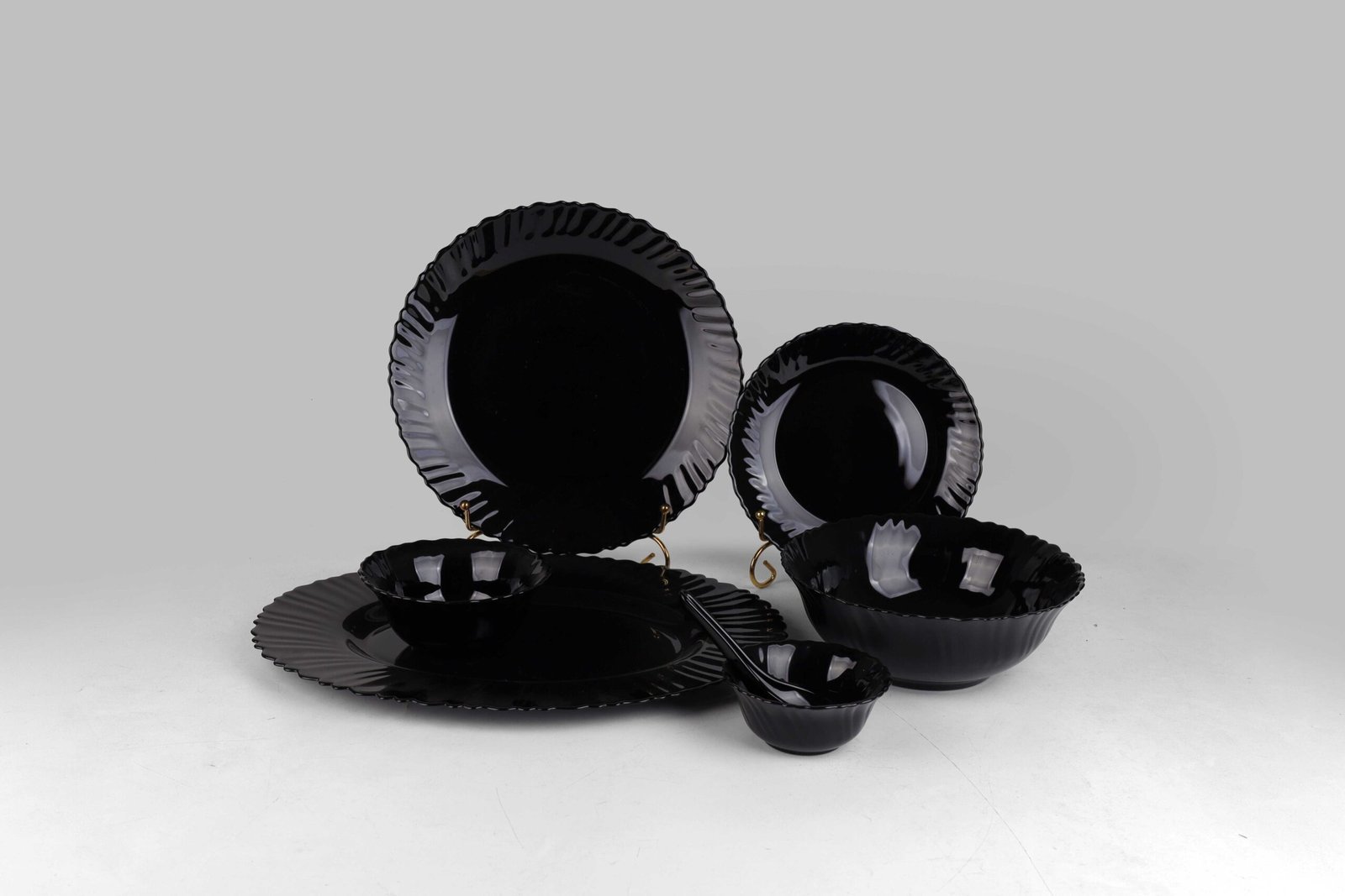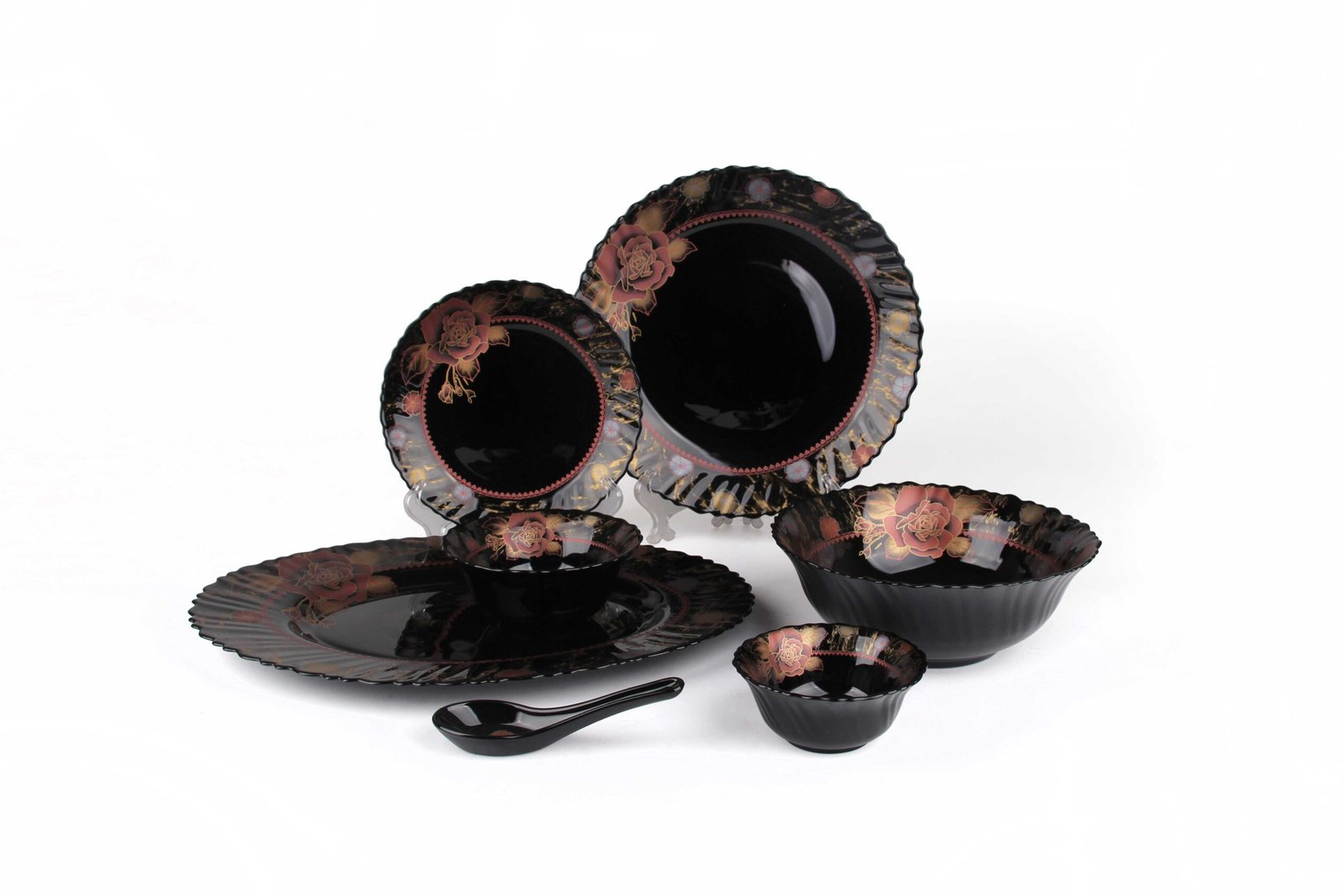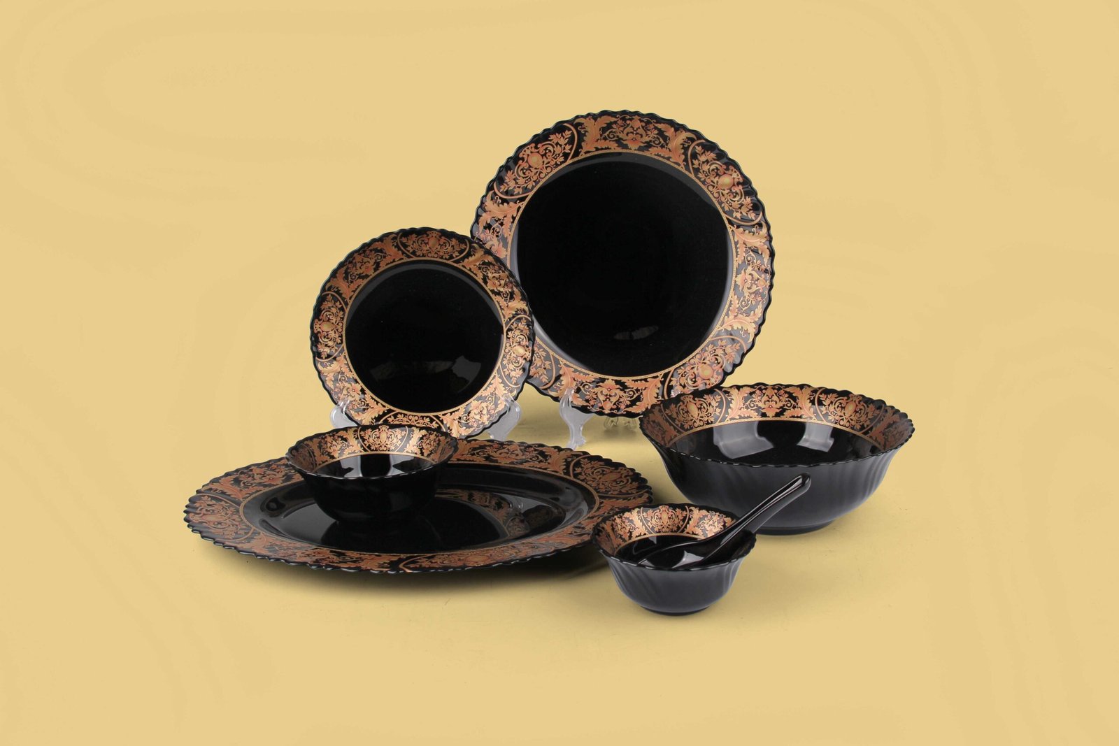 Opal glass Dinner plate: 6PCS, Flat plate: 6PCS, Oval Plate: 1PCS, Salad bowl 4.0: 6PCS, Salad bowl 5.0': 6PCS, Salad bowl 8.0': 2PCS, Soup spoons: 6PCS Yes Black Yes Luxury Golden Decal Yes Yes 1 0.033 7.78 8.7
