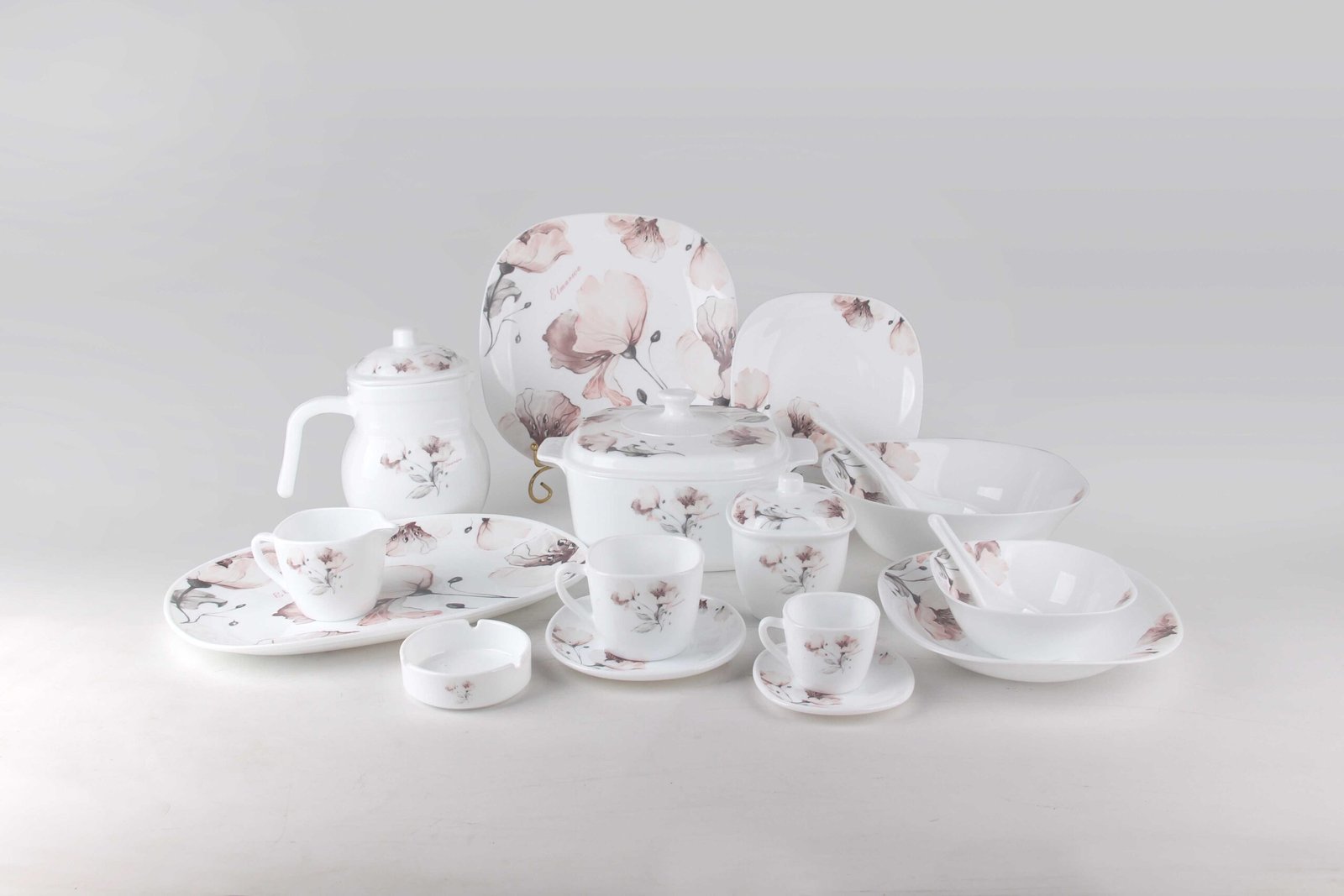 Opal glass Ashtray 3.5": 2PCS, Ladle 9": 2PCS, Soup Spoon: 8PCS, Sprin Square Deep Plate 9": 8PCS, Sprin Square Plate 11": 8PCS, Sprin Square Plate 8": 8PCS, Square Bowl 6": 8PCS, Square Bowl 9.5": 1PCS, Square Casserole 2.5L: 2PCS, Square Casserole lid: 2PCS, Square Coffee Pot 1.5L: 1PCS, Square Coffee Pot lid: 1PCS, Square Cup 220ml: 8PCS, Square Milk Pot 190ml: 1PCS, Square Plate 13.5": 2PCS, Square Plate 5.5": 8PCS, Square Sugar Pot 40ml: 1PCS, Square Sugar Pot lid: 1PCS منفضة سجائر, Bowl, Cup and Dish, Pot Class, Pots, Spoon, Sugar/Milk Cup, Tray Yes White Yes Multi-colored Flowers Yes Yes 1 0.075 23.5 24.5