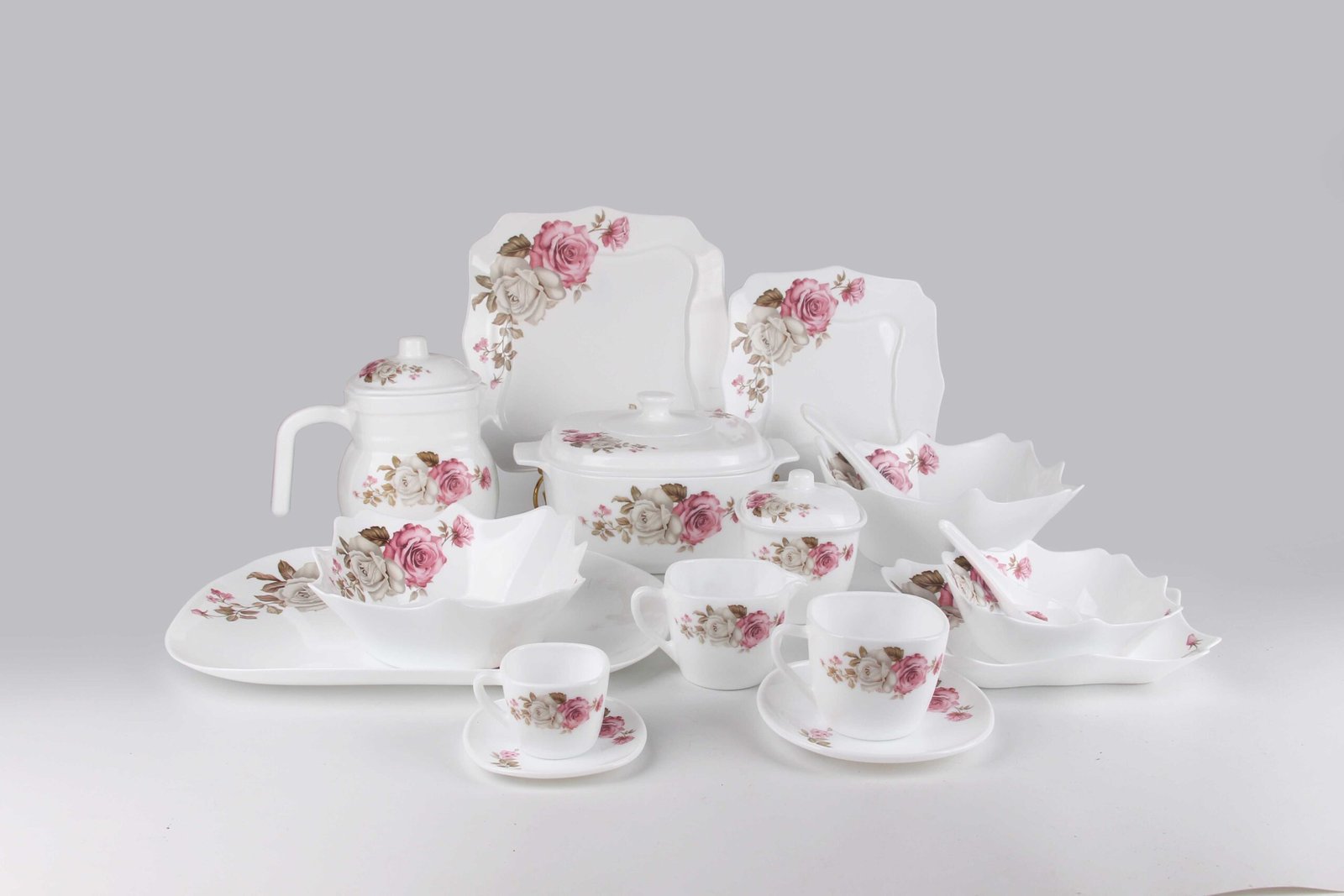 Opal glass BIG SPOON 9: 1PCS, BIG BOWL 10: 1PCS, BIG BOWL 9: 1PCS, CASSROLE 2.5L: 1PCS, CASSROLE LID: 1PCS, COFFEE CUP 220CC: 6PCS, COFFEE POT 2.5L: 1PCS, Coffee Pot Lid: 1PCS, Coffee Pot: 1PCS, Desert plate 10: 6PCS, Dinner plate 12: 6PCS, Milk Pot 190: 1PCS, OVAL PLATE 14: 1PCS, SAUCER 4.5: 6PCS, Saucer 5.5: 6PCS, Soup bowl 7: 6PCS, Soup plate 10: 6PCS, SUGAR POT 4: 1PCS, SUGAR POT LID : 1PCS, TEA CUP 85CC: 6PCS Bowl, Cup and Dish, Pot Class, Pots, Spoon, Sugar/Milk Cup, Tray Yes White Yes Multi-colored Flowers, Multi-colored Leafs Yes Yes 1 0.82 17 18.7