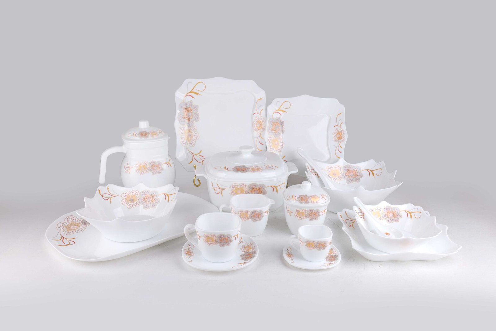 BIG  SPOON 9: 1PCS, BIG BOWL 10: 1PCS, BIG BOWL 9: 1PCS, CASSROLE 2.5L: 1PCS, CASSROLE LID: 1PCS, COFFEE CUP 220CC: 6PCS, COFFEE POT 2.5L: 1PCS, Coffee Pot Lid: 1PCS, Desert  plate 10: 6PCS, Dinner plate 12: 6PCS, Milk Pot 190: 1PCS, OVAL PLATE 14: 1PCS, SAUCER 4.5: 6PCS, Saucer 5.5: 6PCS, SMALL SPOON 5.5": 6PCS, Soup  bowl 7: 6PCS, Soup  plate 10: 6PCS, SUGAR POT 4: 1PCS, TEA CUP 85CC: 6PCS