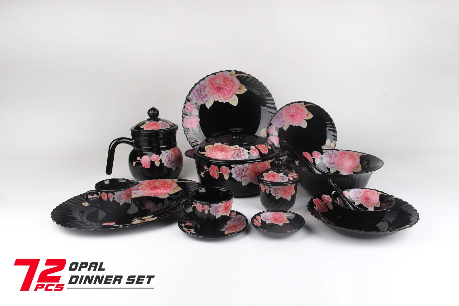 Opal glass Casserole 2.5 lid: 2PCS, Casserole 2.5: 2PCS, Coffee cup 190CC: 8PCS, Coffee Pot Lid: 1PCS, Coffee Pot: 1PCS, Dinner Plate 10.5: 8PCS, Flat plate 7.5: 8PCS, Ladle: 2PCS, Milk Pot 190: 1PCS, Oval Plate 13: 2PCS, Salad Bowl 5.0: 8PCS, Salad bowl 9.0: 1PCS, Saucer 4: 2PCS, Saucer 5.5: 8PCS, Soup plate 8.5: 8PCS, Soup Spoon: 8PCS, Sugar Pot 40: 1PCS, SUGAR POT LID : 1PCS Bowl, Cup and Dish, Pot Class, Pots, Spoon, Sugar/Milk Cup, Tray Yes Black Yes Multi-colored Flowers Yes Yes 1 0.074 18.71 20.71